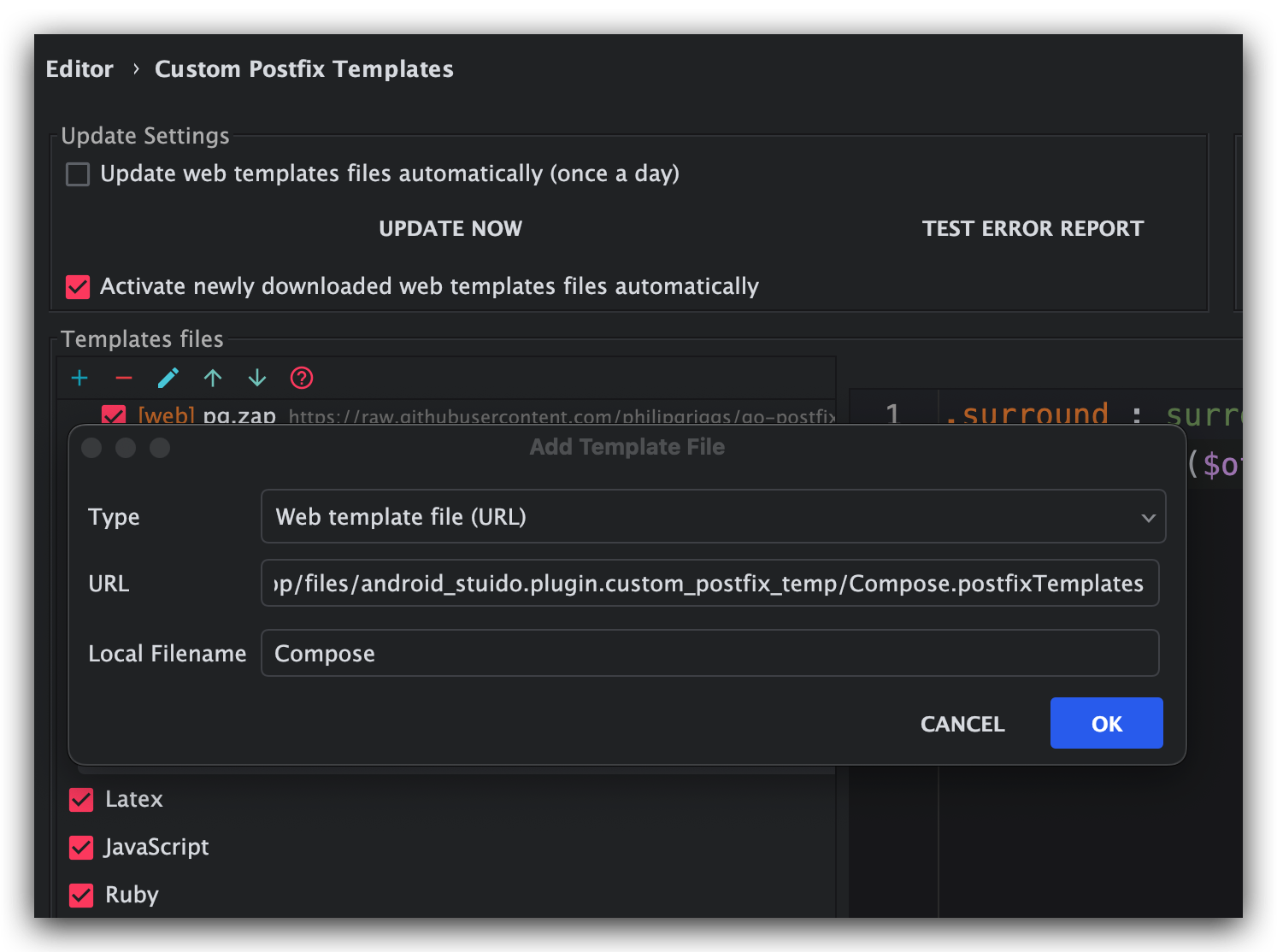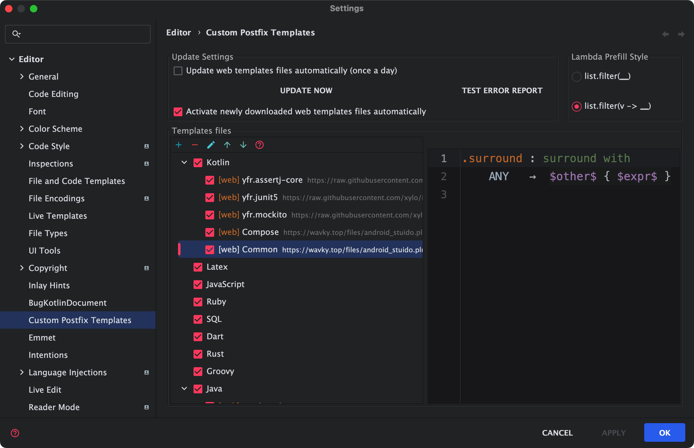 如下图所示,在 Custom Postfix Templates 设置中,点击 + 号按钮添加一个 Templates file 文件,语言选择 Kotlin,类型选择 Web template file,将下方的模板链接复制过去,并为文件提供命名即可。