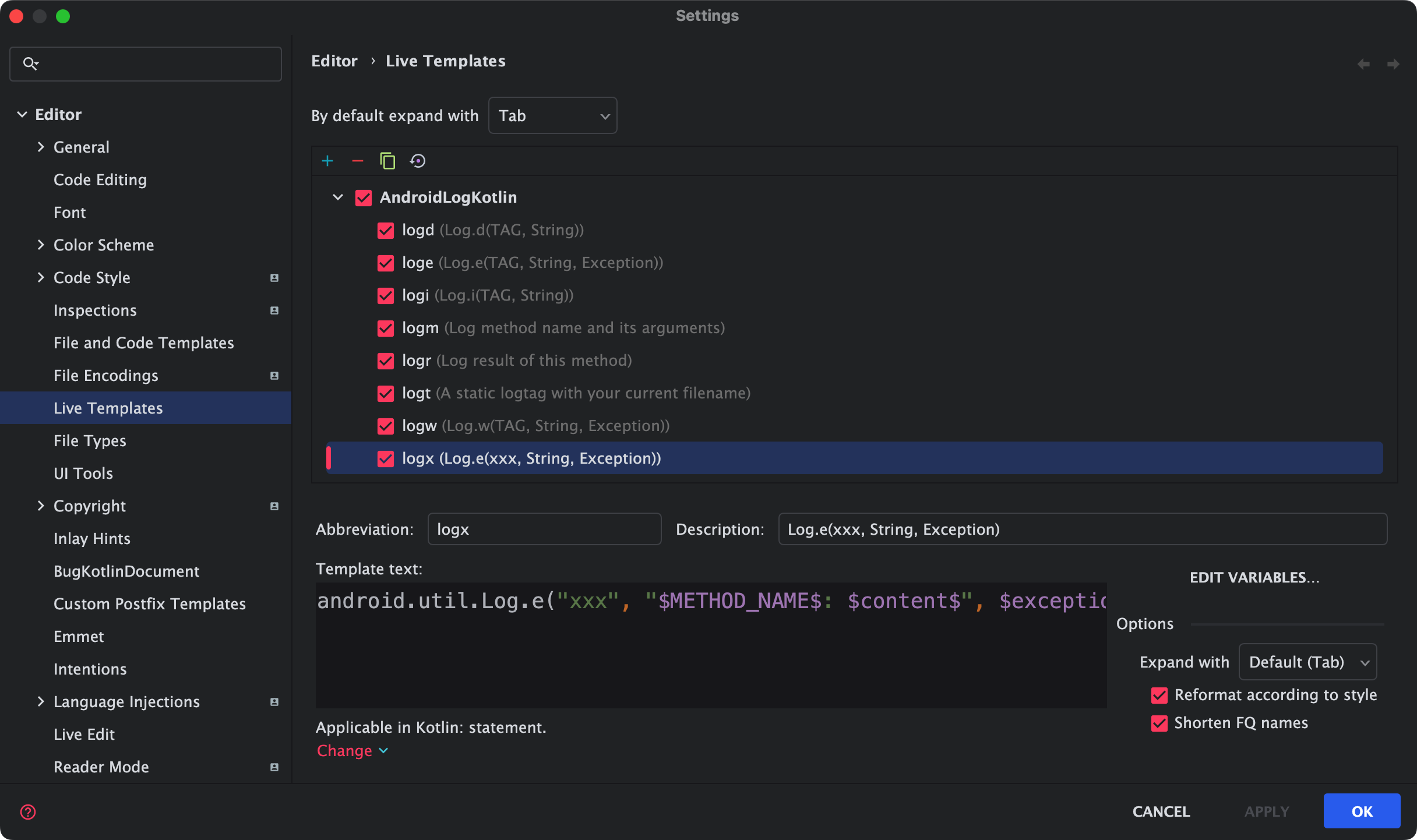 - logxe:生成 Log.e(“xxx”, “$METHOD_NAME$: $content$”, new Exception());