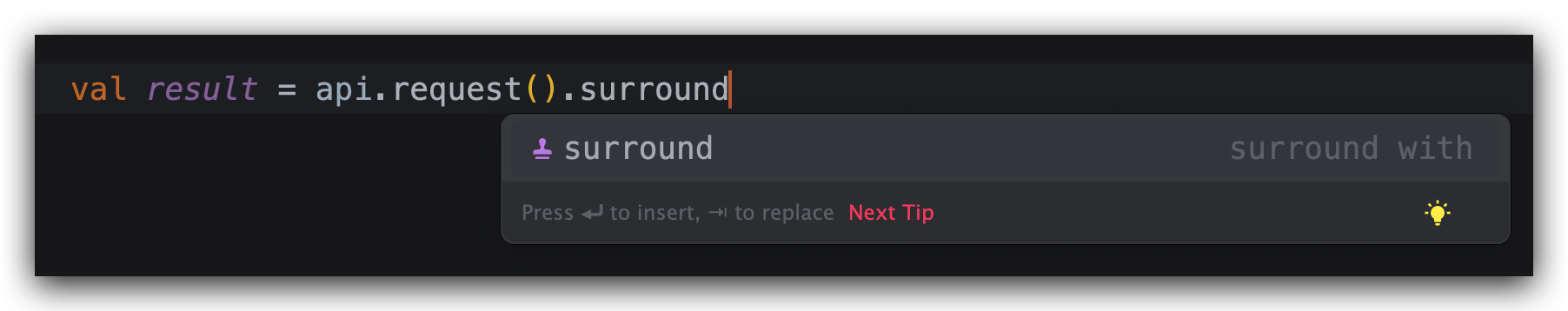 以上图为例,自定义了一个 surrund 模板,在输入 val result = api.request().surround 时,点按回车会自动转换为以下形式: